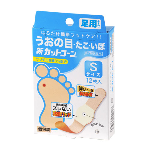 「新カットコーン Sサイズ 12枚」は、サリチル酸を50%配合した、うおの目・たこ・いぼ取り用の医薬品です。サリチル酸の角質軟化作用で、うおの目・たこ・いぼを取り除きます。ソフトな保護パッドで圧迫による患部の痛みをやわらげます。粘着テープには、皮膚の動きにフィットする伸縮性のある布を使用しています。粘着力がよく、患部をしっかり固定するため、他のテープを使用する必要がありません。