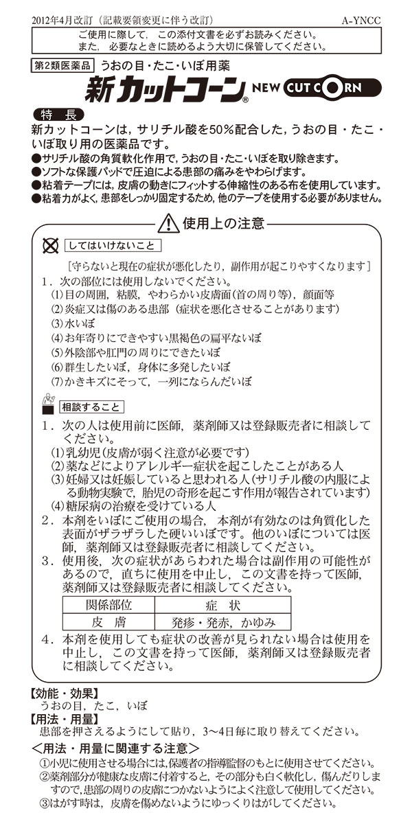 ■してはいけないこと 〔守らないと現在の症状が悪化したり、副作用が起こりやすくなります〕 1.次の部位には使用しないでください。 (1)目の周囲、粘膜、やわらかい皮膚面(首の周り等)、顔面等 (2)炎症又は傷のある患部(症状を悪化させることがあります) (3)水いぼ (4)お年寄りにできやすい黒褐色の扁平ないぼ (5)外陰部や肛門の周りにできたいぼ (6)群生したいぼ、身体に多発したいぼ (7)かきキズにそって、一列にならんだいぼ ■相談すること 1.次の人は使用前に医師、薬剤師又は登録販売者に相談してください。 (1)乳幼児(皮膚が弱く注意が必要です) (2)薬などによりアレルギー症状を起こしたことがある人 (3)妊婦又は妊娠していると思われる人(サリチル酸の内服による動物実験で、胎児の奇形を起こす作用が報告されています) (4)糖尿病の治療を受けている人 2.本剤をいぼにご使用の場合、本剤が有効なのは角質化した表面がザラザラした硬いいぼです。他のいぼについては医師、薬剤師又は登録販売者に相談してください。 3.使用後、次の症状があらわれた場合は副作用の可能性があるので、直ちに使用を中止し、この文書を持って医師、薬剤師又は登録販売者に相談してください。 [関係部位:症状] 皮膚:発疹・発赤、かゆみ 4.本剤を使用しても症状の改善が見られない場合は使用を中止し、この文書を持って医師、薬剤師又は登録販売者に相談してください。