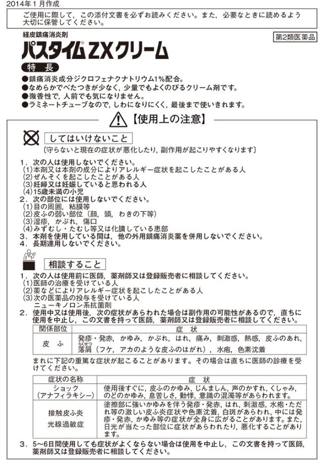 「パスタイムZXクリーム 30g」は、なめらかでべたつきが少なく、少量でもよくのびるクリーム剤です。鎮痛消炎成分ジクロフェナクナトリウム1%配合。微香性で、人前でも気になりません。ラミネートチューブなので、しわになりにくく、最後まで使いきれます。