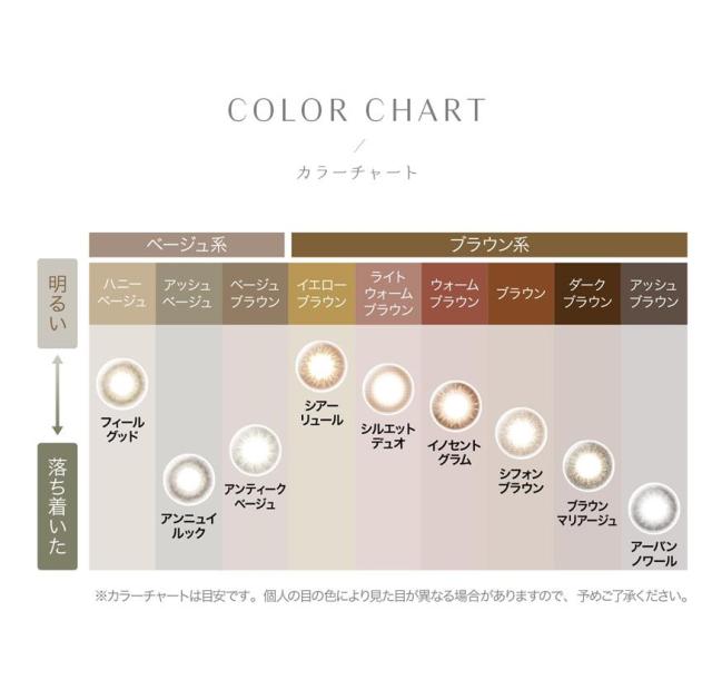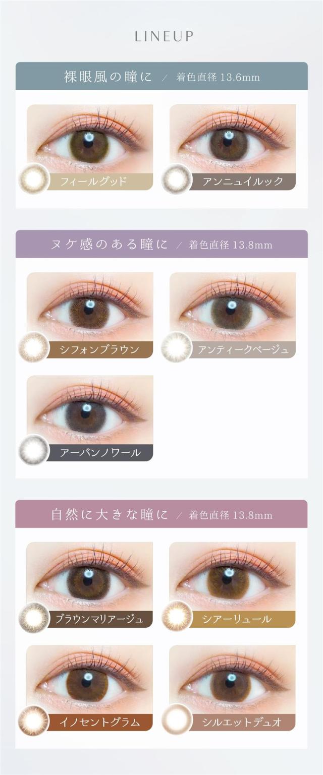 アーバンノワール、アンティークベージュ、ブラウンマリアージュ、イノセントグラム、シフォンブラウン、シアーリュール、シルエットデュオ、フィールグッド、アンニュイルック