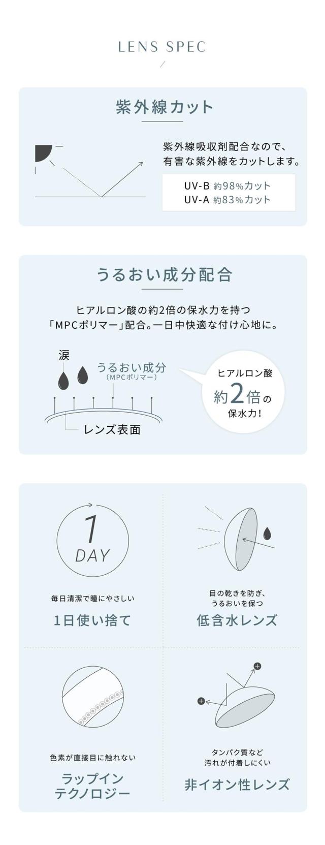 ※使い捨てコンタクトレンズご購入に関する遵守事項について 眼科医の指示を受け、それをお守りください。 製品に添付されている使用者向け添付文書を読み熟知ください。 装用時間、装用サイクルをお守りください。 取扱方法を守り正しくご使用ください。 定期検査を必ずお受けください。 少しでも異常を感じたら直ちに眼科医の検査をお受けください。 ※イメージ違いや開封後の返品はできませんので予めご了承ください。