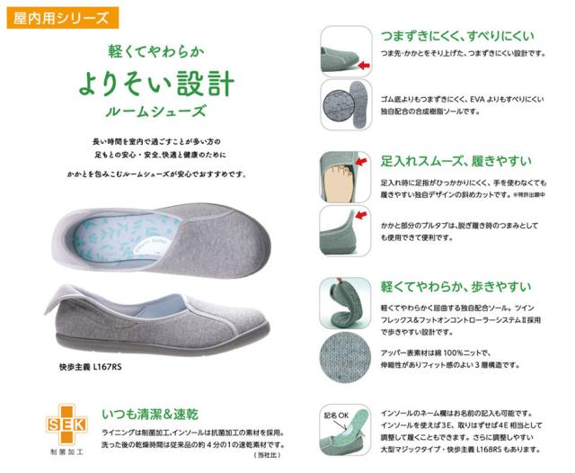 「快歩主義 レディースルームシューズ L167RS グレー(品番 KS30164)」は、長い時間を室内で過ごすことが多い方の足元の安心安全、快適と健康のためにかかとを包み込むルームシューズです。つま先・かかとをそり上げたつまずきにくい設計。EVAよりもすべりにくい軽量エクスパンセル配合の合成樹脂ソール。足入れがスムーズで履きやすい。軽くてやわらかで歩きやすい。インソールには名前の記入ができるネーム欄付き。