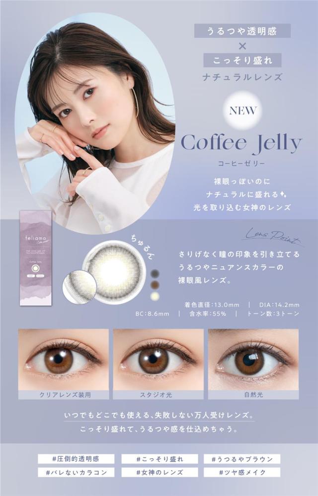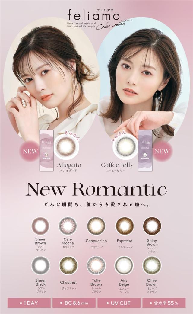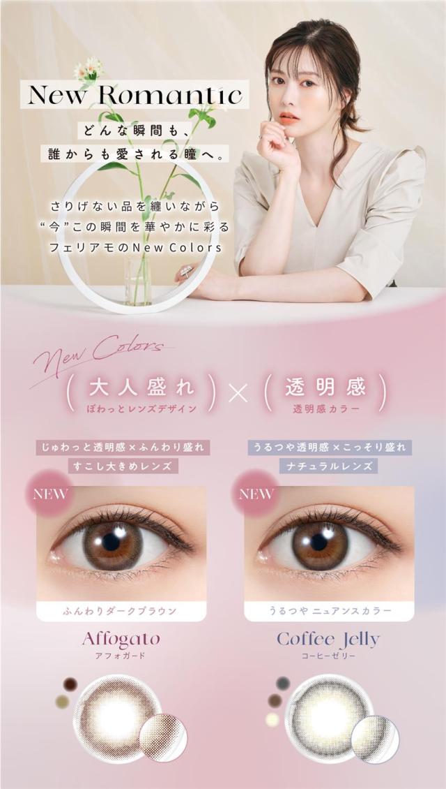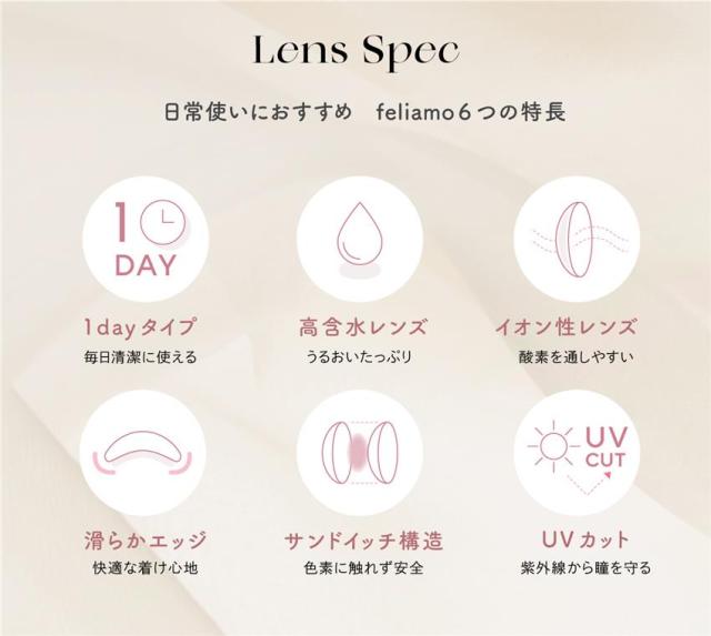 「フェリアモ feliamo ワンデー カラコン 10枚」は、恋する全ての女性の為にをコンセプトに作られたカラーコンタクトです。男性から好印象を抱かれる瞳をテーマに開発されたナチュラルレンズが特徴。自分の目になじんで、自然に大きく潤った瞳にみせてくれます。酸素を通しやすいイオン性、潤いたっぷりの高含水レンズを使用した1dayカラコンです。
