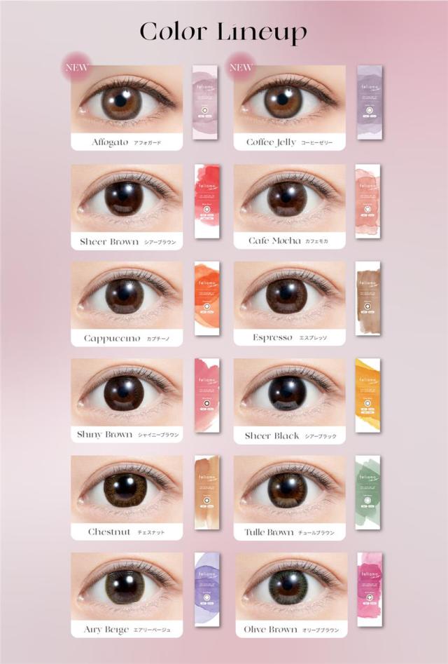 アフォガード、コーヒーゼリー、シアーブラウン、カフェモカ、カプチーノ、エスプレッソ、シャイニーブラウン、シアーブラック、チェスナット、チュールブラウン、エアリーベージュ、オリーブブラウン