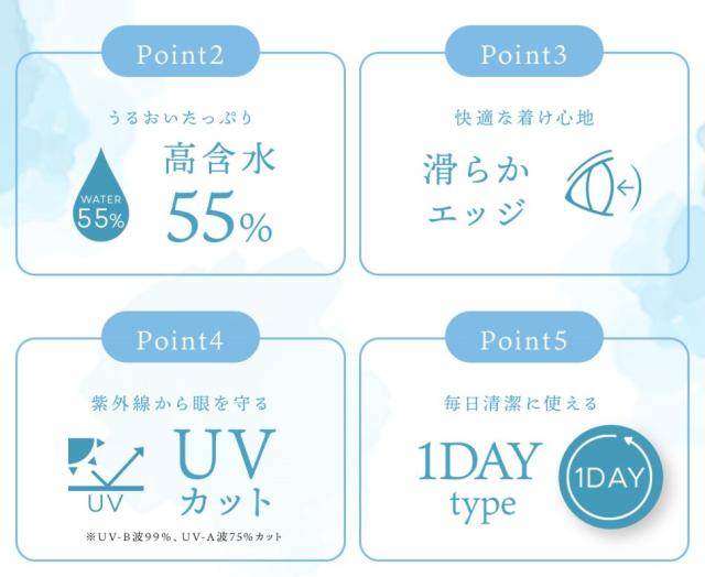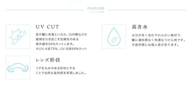 「フェリアモ feliamo クリアコンタクト ワンデー 30枚」は、カラコンを使えない日やデイリー使いにおすすめのクリアコンタクトレンズです。瞳馴染みの良い高含水率55%に、UVカット機能付きの瞳に嬉しいレンズです。