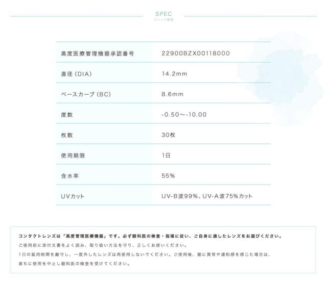 ※使い捨てコンタクトレンズご購入に関する遵守事項について 眼科医の指示を受け、それをお守りください。 製品に添付されている使用者向け添付文書を読み熟知ください。 装用時間、装用サイクルをお守りください。 取扱方法を守り正しくご使用ください。 定期検査を必ずお受けください。 少しでも異常を感じたら直ちに眼科医の検査をお受けください。 ※イメージ違いや開封後の返品はできませんので予めご了承ください。