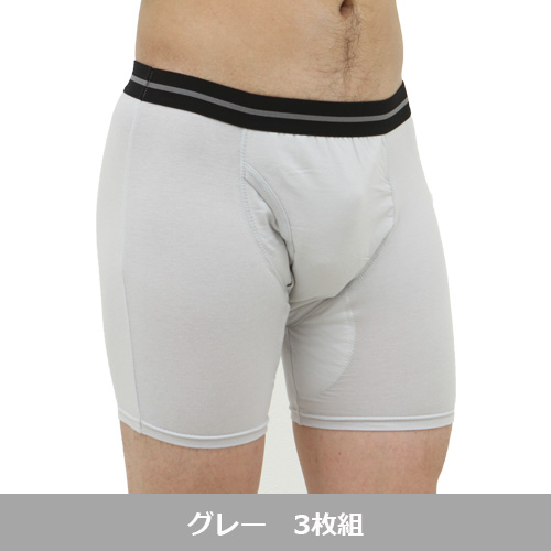「渡嘉毛織 NEWフィフティーボクサーパンツ グレー 3枚組」は、薄くて、一見洒落たトランクスに見えて、程良い吸水力のあるパンツです。厚みを抑えて快適な着用感。吸水部のボリュームをなくして、普通の下着と変わらないはき心地です。太ももの内側までカバーする吸水部。伝わって漏れる不快感もなし! 若々しい印象に。