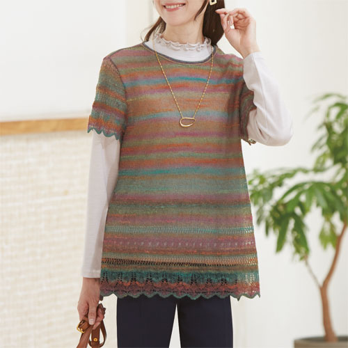 日本製 五泉で編んだかすりモヘヤのエアリーベスト ニットベスト プルオーバータイプ クルーネック ベージュ系 レディース 婦人服 ミセス シニア 女性 チョッキ ボーダー 丸首 モヘア シニアファッション 40代 50代 60代 70代 80代 母の日 お母さん おばあちゃん 秋冬