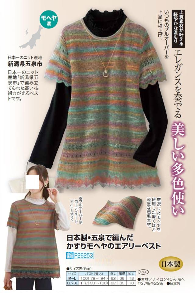日本製 五泉で編んだかすりモヘヤのエアリーベスト ニットベスト プルオーバータイプ クルーネック ベージュ レディース 婦人服 ミセス シニア 女性 チョッキ ボーダー 丸首 モヘア シニアファッション 50代 60代 70代 80代 母の日 お母さん おばあちゃん 秋冬 fri p26253