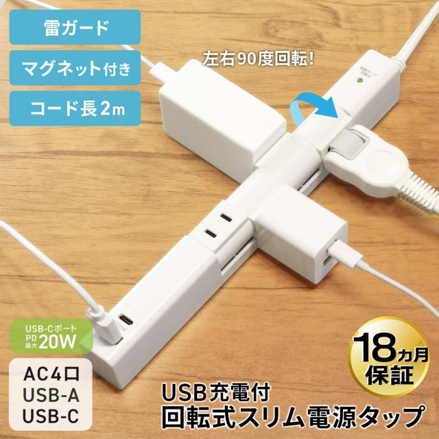 【メール便送料無料・18ヶ月保証】STYLED 回転式 電源タップ PD20W USB充電 マグネット付き ACコンセント 4口 2m ホワイト 延長コード 回転タップ 雷ガード 18ヵ月保証 1400W スイングプラグ OAタップ 延長コード ホワイト PTRP4CAW-2