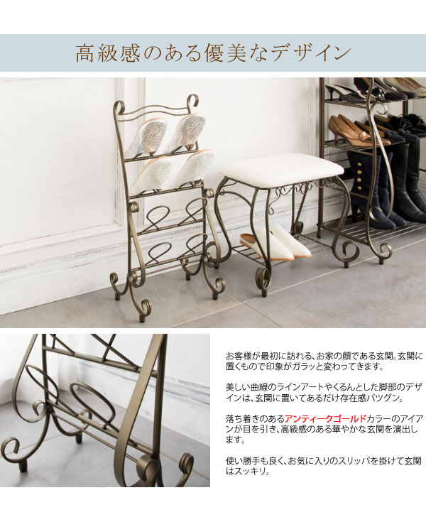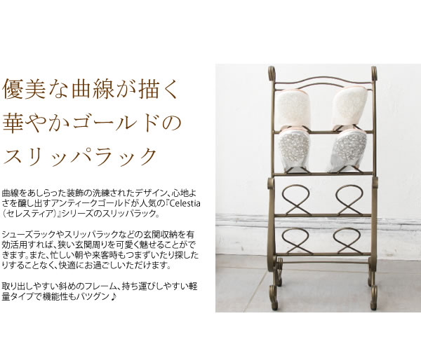曲線をあしらった装飾の洗練されたデザイン、心地よさを醸し出すアンティークゴールドが人気の『Celestia(セレスティア)』シリーズのスリッパラック。