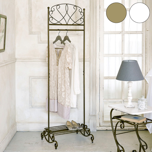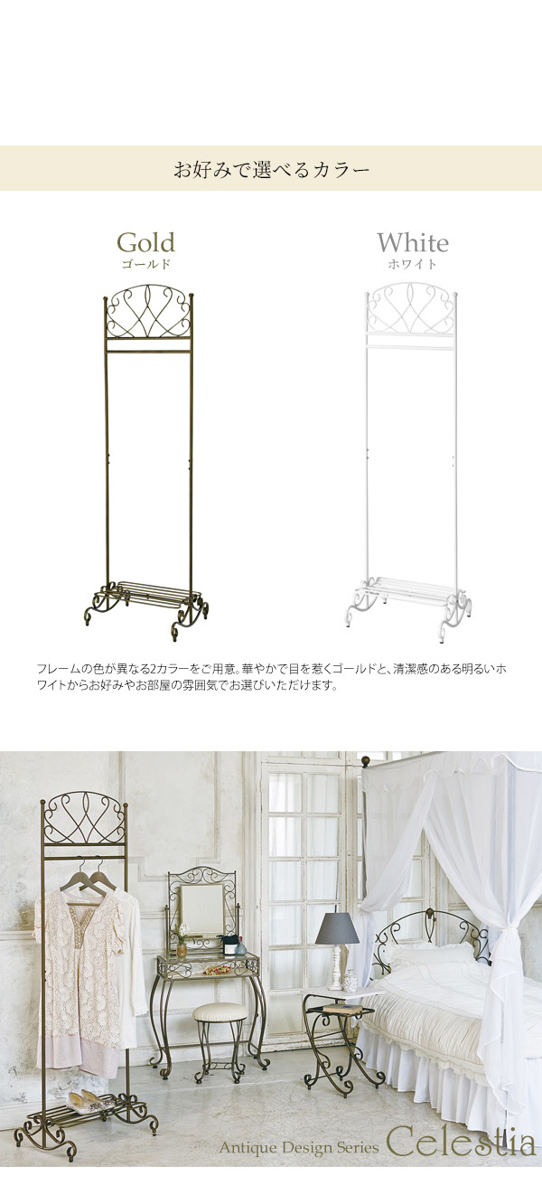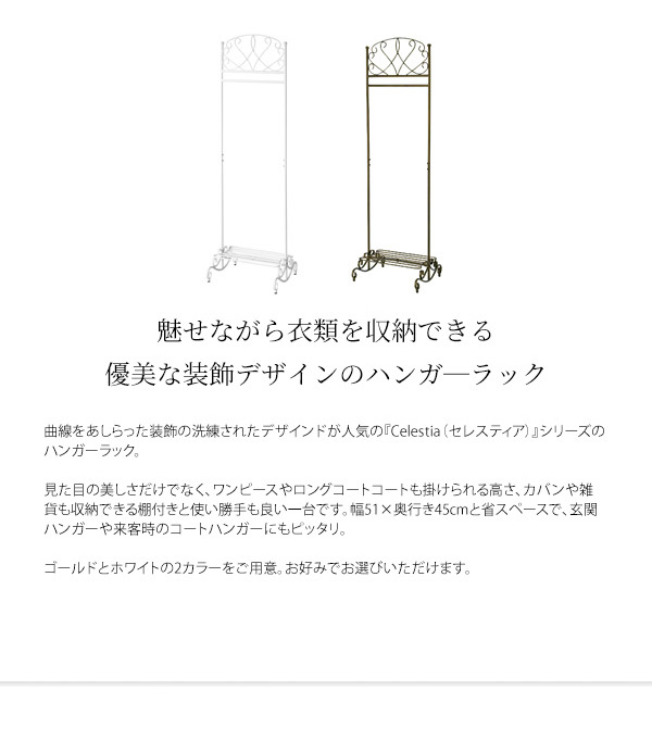 曲線をあしらった装飾の洗練されたデザイン、心地よさを醸し出すアンティークゴールドが人気の『Celestia(セレスティア)』シリーズのハンガーラック。