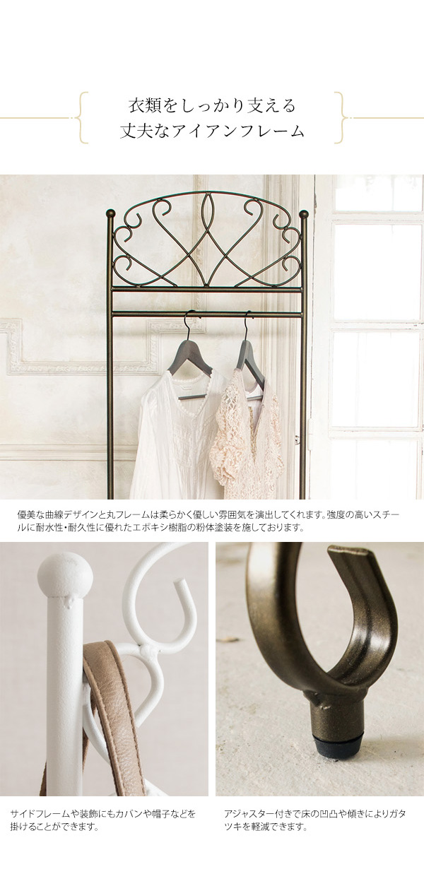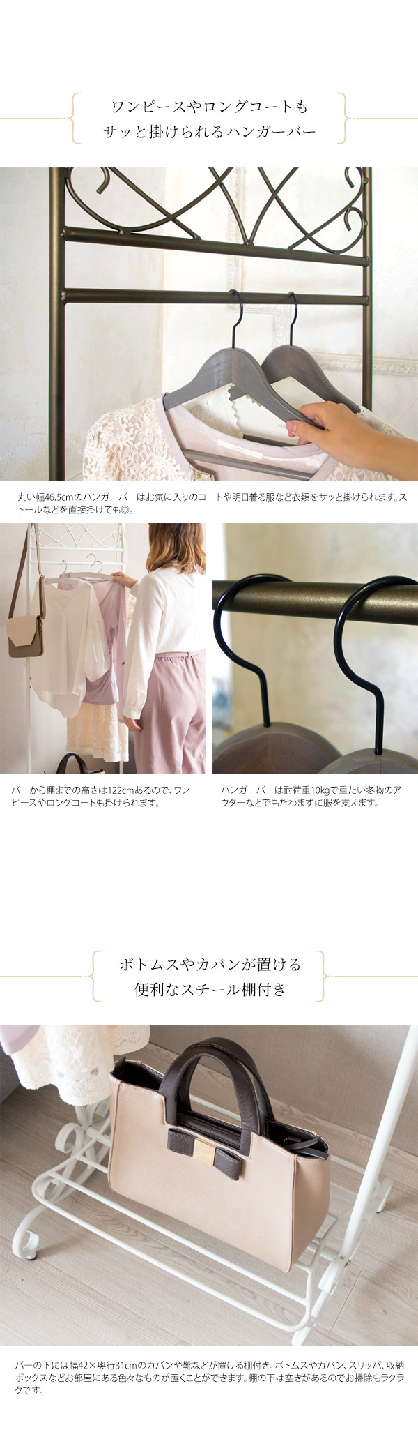見た目の美しさだけでなく、ワンピースやロングコートコートも掛けられる高さ、カバンや雑貨も収納できる棚付きと使い勝手も良い一台です。