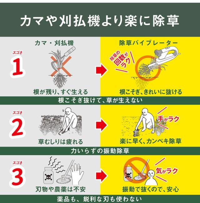 ・充電式なので離れた場所。力いらずで振動の力で根こぞぎ除草。・細かく前後に振動する力で根ごと抜き取るので雑草が生えにくく、鎌で刈り取ってもすぐに伸びてくる雑草も、根っこから抜き取る事で、新しく雑草が中々生えにくい。