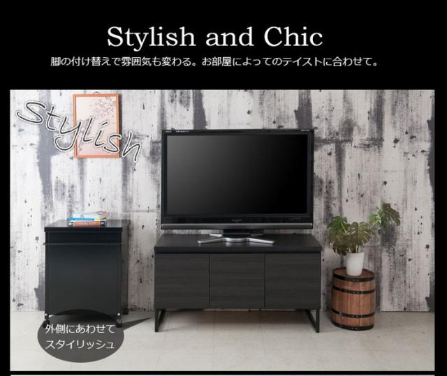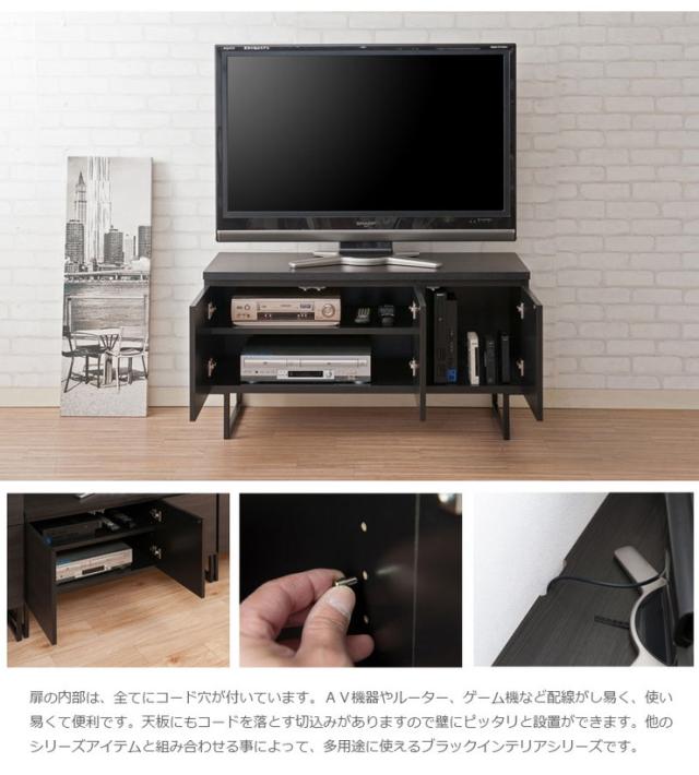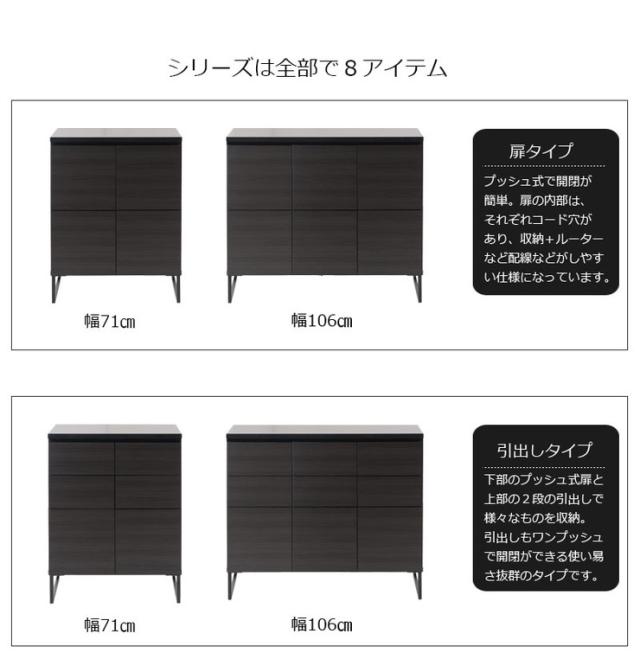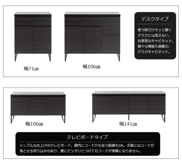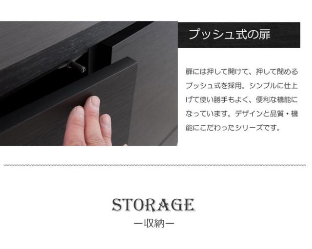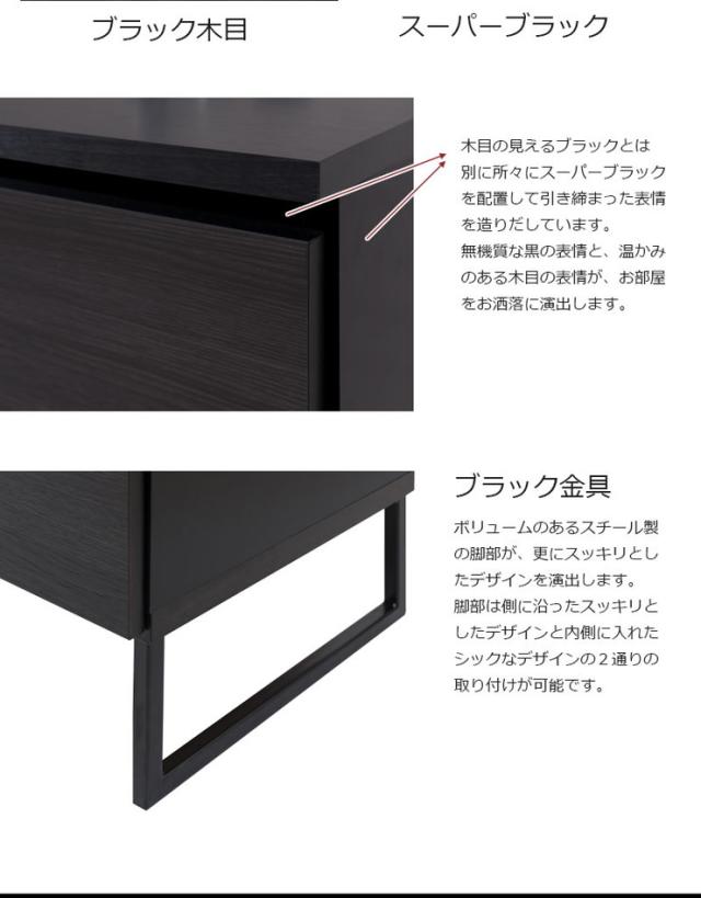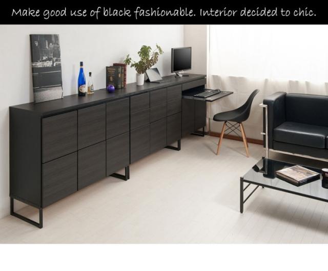 ■商品について/オールブラックで仕上げたキャビネットは風格のある存在感。細脚からスタイリッシュに完成されたスクエア感は直線的で黒木目とマッチ。扉・引出しの構成のキャビネットやローボードに機能的なデスクタイプも加わりリビング空間をカッコよく演出。ソリッドブラックな脚部や細部に木目の効いた表面材が絶妙なバランス。