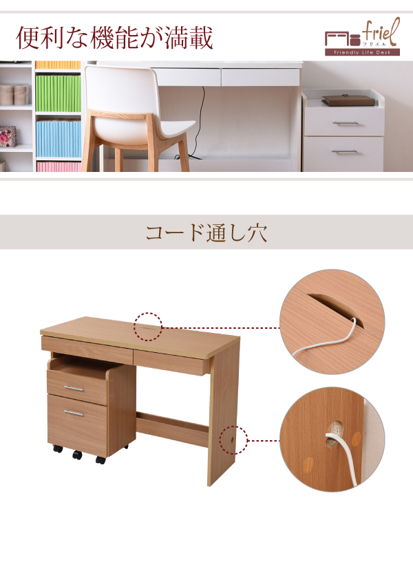 シンプルなデスクにチェストが付いたセットアイテム。デスクの足元には配線が収納できるスペースがあり、パソコンなどの充電コードが邪魔になりません。幅100cm、奥行45cmのコンパクトなデザインは、書斎でもリビングでも置き場所に困らずご使用いただけます。