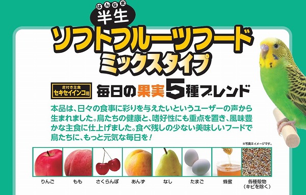 鮮やかな見た目とフルーティーな香りが鳥たちの食欲をそそります。健康に配慮し、殻付きの原料のみを使用し、キビ原料の完全不使用。