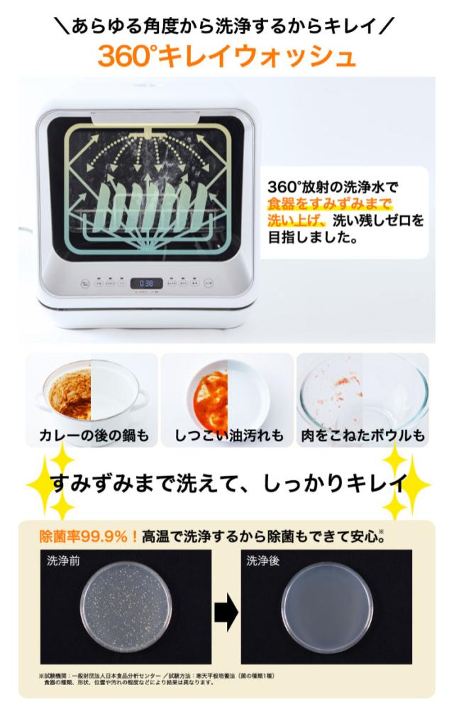 シロカ独自の洗浄技術により、360°あらゆる角度からの洗浄を可能にしました。洗い残しのほとんどない、美しい洗い上がりを実現します。高さ2mメートルまで吹き上げる水圧で頑固な汚れもきれい。