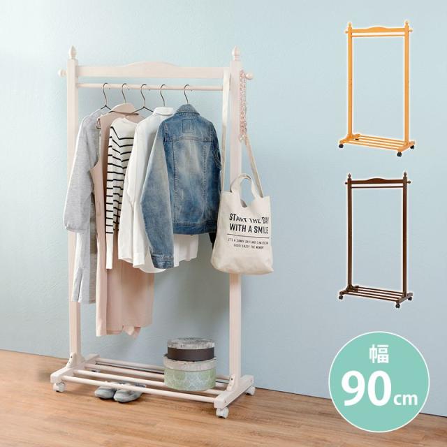 ハンガーラック キャスター付き 木製 ラバーウッド 幅90cm 奥行40cm 高さ154cm 棚付き コートハンガー VR-7238 萩原 移動(代引不可)【送