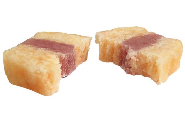 小麦粉、鶏ささみ、ショートニング、ブルーベリーフィリング、ソルビトール、プロピレングリコール、膨張剤、保存料(ソルビン酸K)、食塩、pH調整剤、着色料(クチナシ、赤2、赤106、青1、青2)、酸化防止剤(エリソルビン酸Na)、香料