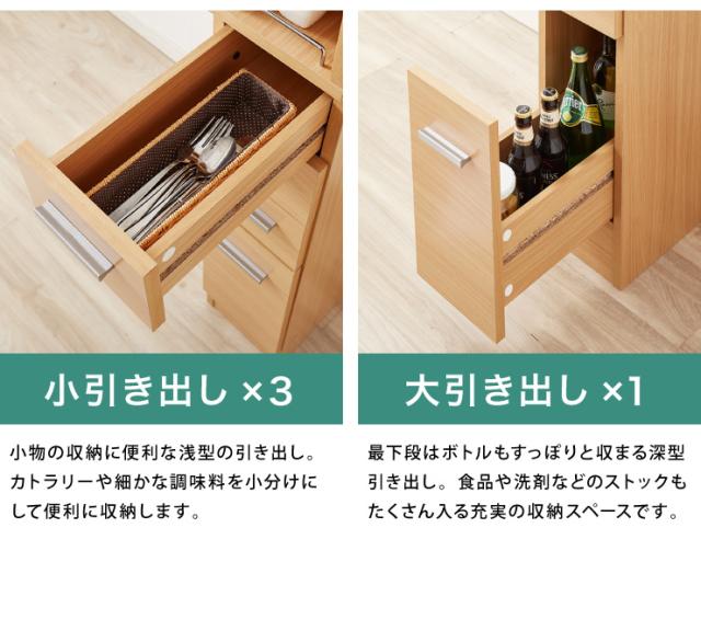 小物の収納に便利な小引出しと、調味料等のストックに便利な大引出しで、使い勝手の良い収納が可能。