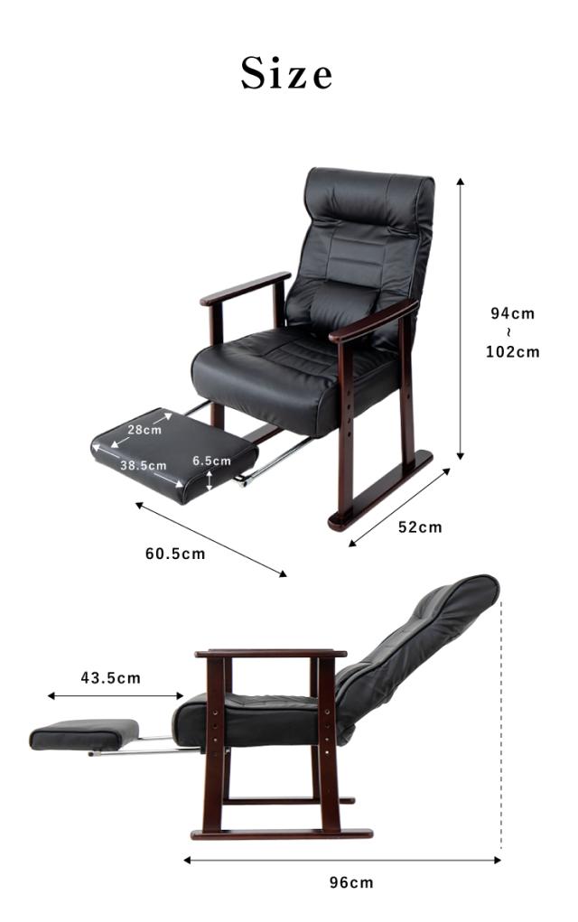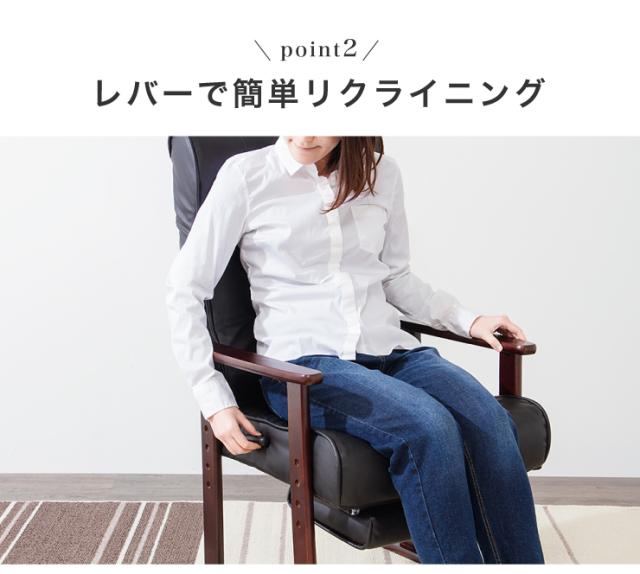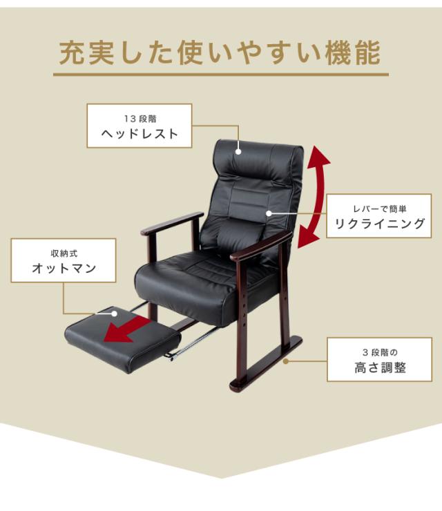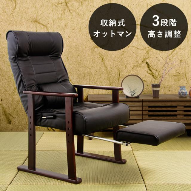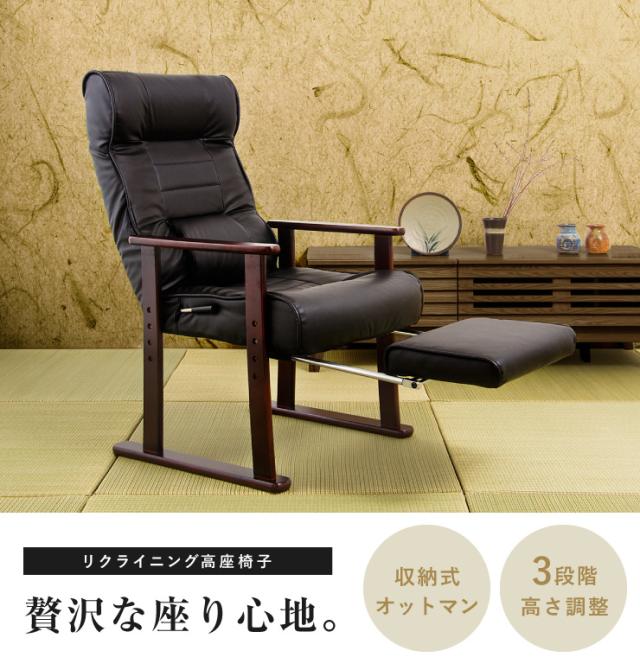 木製肘付リクライニング高座椅子(フットレスト付) ヘッドレスト 肘掛 椅子 高齢者 介護 立ち座り 和室 レバー オットマン 黒(代引不可)【送料無料】