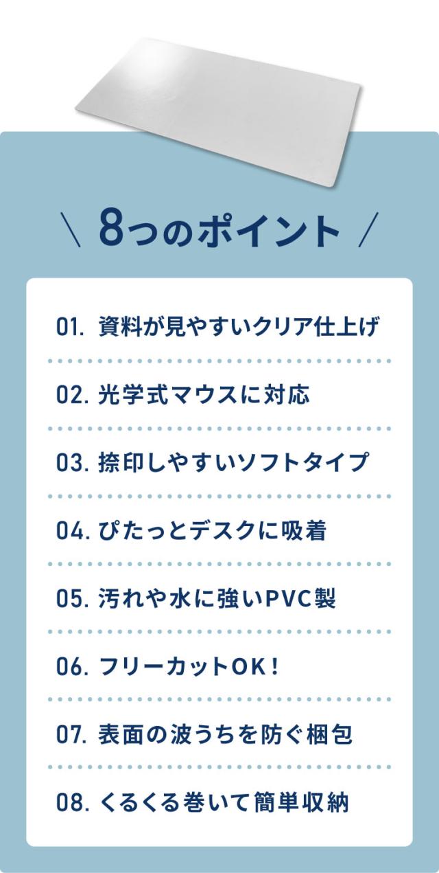 耐熱使用 光学マウス対応 マウス操作可能 フラット 吸着 撥水 防汚性 撥水性 防汚 角丸加工 コンパクト とうめい くりあ ベタつかない カットOK 保護シート 机 エンポス お手入れ簡単 ソフト