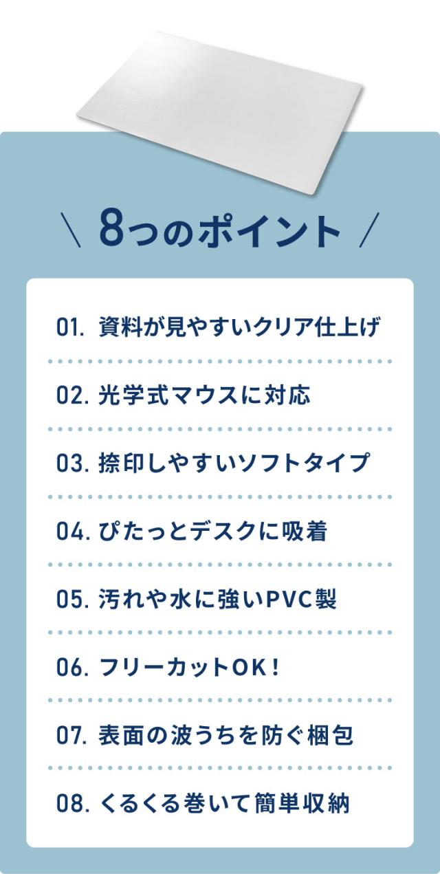 耐熱使用 光学マウス対応 マウス操作可能 フラット 吸着 撥水 防汚性 撥水性 防汚 角丸加工 コンパクト とうめい くりあ ベタつかない カットOK 保護シート 机 エンポス お手入れ簡単 ソフト
