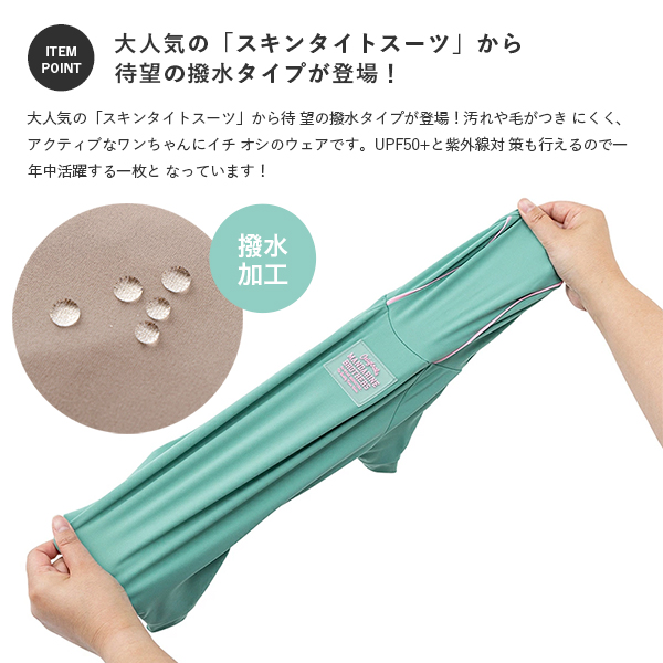 人気アイテム「スキンタイトシリーズ」から待望の汚れや毛が付きにくい撥水タイプが登場!フードのパイピングカラーとクリアラバーワッペンの配色バランスがポイントのアクティブなワンちゃんにおすすめウェアです。 水も汚れもしっかりガード!紫外線対策もばっちりの撥水アクティブウェアで、愛犬とお外を思いっきり楽しみましょう!