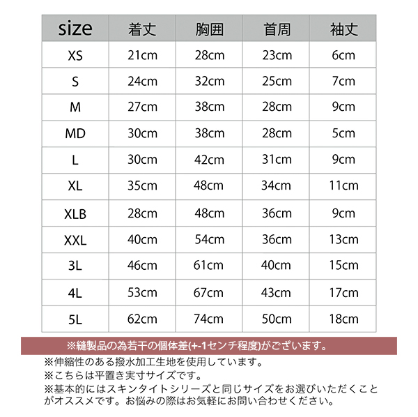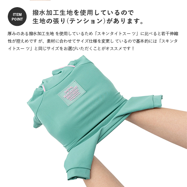 こちらの商品につきましては縦横共に伸縮性がございますが、通常のスキンタイトスーツに比べると伸縮性は控えめです。生地自体にも張り(テンション)があり着用感が異なりますのでサイズにはご注意ください。