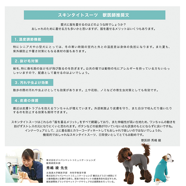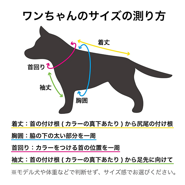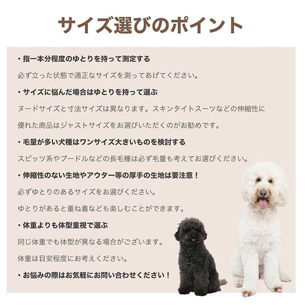 お洋服の着丈がワンちゃんの着丈より長すぎる、またはぴったり過ぎると歩行中尻尾にかかってしまったり排泄物がお洋服にかかってしまう場合がございますのでご注意ください。特に断尾をしている子・ボブテイルの子はご注意ください。