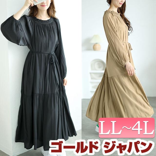 春新作 大きいサイズ レディース ワンピース フリルネックティアードワンピース ワンピ ロング マキシ ボリューム袖 長袖 フリルネック ティアード ギャザー ウエストリボン ポケット フレア カジュアル 冬服 春服 F フリー LL 2L 3L 4L ブラック カーキ ゴールドジャパン