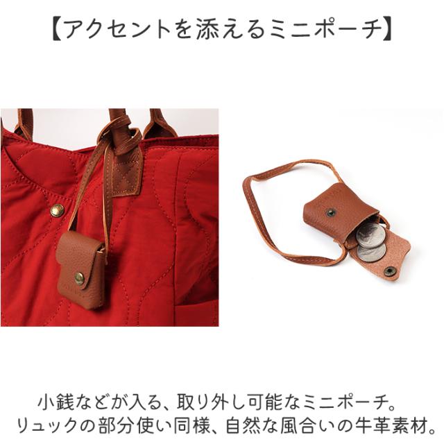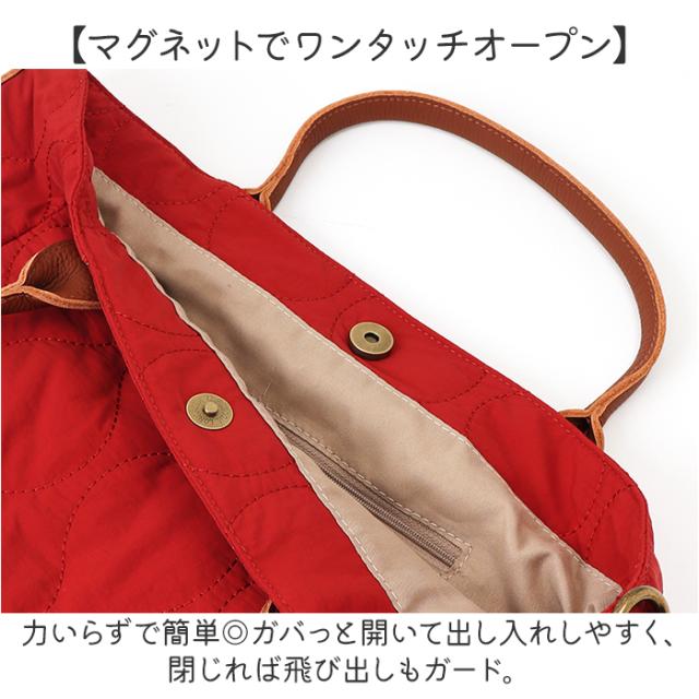 | 商品説明 | 【頼りになるお出かけの相棒☆】 ・色んなシーンで活躍!おしゃれに持てる「toleur ナイロンキルティング2WAYトート」 【キレイめカジュアルスタイルに♪】 ・さらりとしたナイロン生地に、ふんわりキルトデザイン。各所に牛革を使い、上品な仕上がりに。 【お好みに合わせてスタイルチェンジ】 ・手持ちではもちろん。長さ調節可能なショルダーを取り付け肩掛けや斜め掛けも自在な2WAY☆ 【マグネットでワンタッチオープン】 ・力いらずで簡単◎ガバっと開いて出し入れしやすく、閉じれば飛び出しもガード。 【荷物が多めの方も安心の収納力】 ・しっかりマチを設け、デイリー使いに十分なサイズ。通勤通学や1泊旅行、マザーズバッグにも☆ (※)横幅いっぱいに使うとA4サイズが収納可能ですが、物によっては角が折れる可能性等があります。 【サクッと取り出せて迷子知らず】 ・内側・外側合わせて6個のポケットを配置。整頓しやすく、バッグの中で小物を探す手間が不要。 【軽やかな使い心地でノンストレス】 ・体に負担をかけない軽量設計。疲れを軽減できるのが嬉しいポイント。 【アクセントを添えるミニポーチ】 ・小銭などが入る、取り外し可能なミニポーチ。リュックの部分使い同様、自然な風合いの牛革素材。 【お気に入りを選べるカラー】 ・ベーシックや、差し色になるカラーをラインナップ。なりたいイメージでチョイス! 【大切な方への贈り物におすすめ】 ・年代や季節問わず使いやすく、ギフトにも最適。保管に役立つ不織布素材の収納袋付き。 【toleur-トーラ-】 ・沢山の人にレザーを使ったバッグ 【ポケット仕様】 ・内側:ファスナーポケット×1、オープンポケット×2 ・前面:マグネットポケット×1 ・サイド:オープンポケット×2 |
