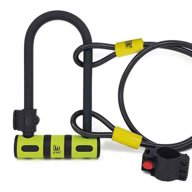 アーバン レベル 10: 自転車、電動スクーター、またはスクーター用の耐性セキュリティ パック。コンパクトで軽量な U レベル 10 の盗難防止南京錠と、ループ ケーブルおよび輸送用ブラケット。南京錠 最適なサイズ 80x190 mm で、より用途が広く機能的です。