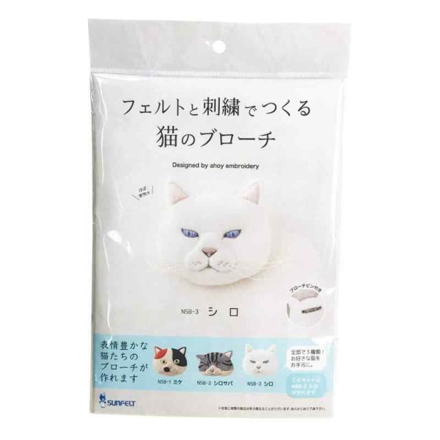 サンフェルト フェルトと刺繍でつくる猫のブローチ シロ 横70mm×縦70mm×厚さ10mm ブローチピンとレシピ付き SFNSB-3 ホワイト