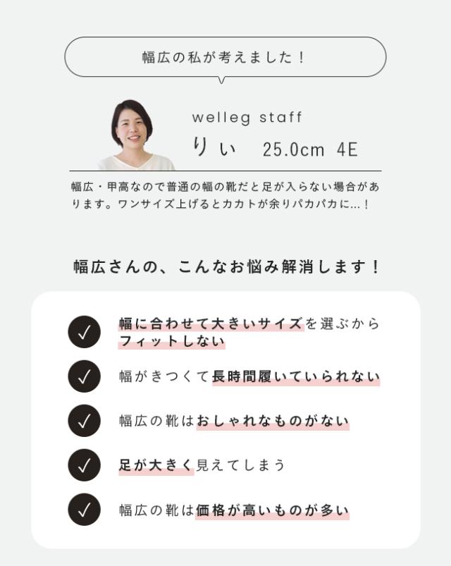 幅広さんに、おしゃれを諦めずおでかけを心から楽しんでほしい。そんな想いでお客さまと同じ悩みを抱える幅広スタッフがデザイン・履き心地を見直し、とことんこだわり修正を重ね、納得の1足ができました!