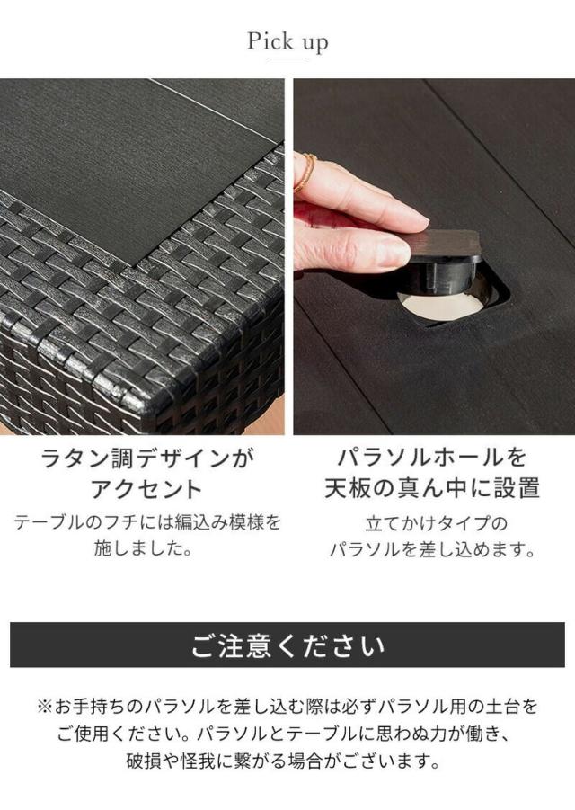 ・テーブルは、天板の真ん中に穴が空いているので、パラソルを差し込むことが可能です。