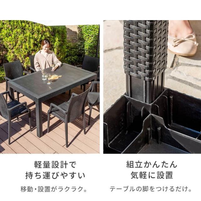 ・テーブルは、天板の真ん中に穴が空いているので、パラソルを差し込むことが可能です。
