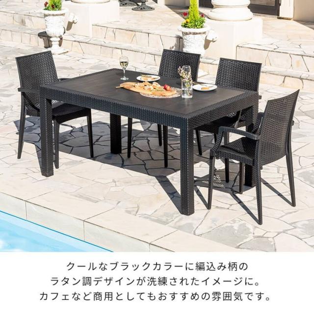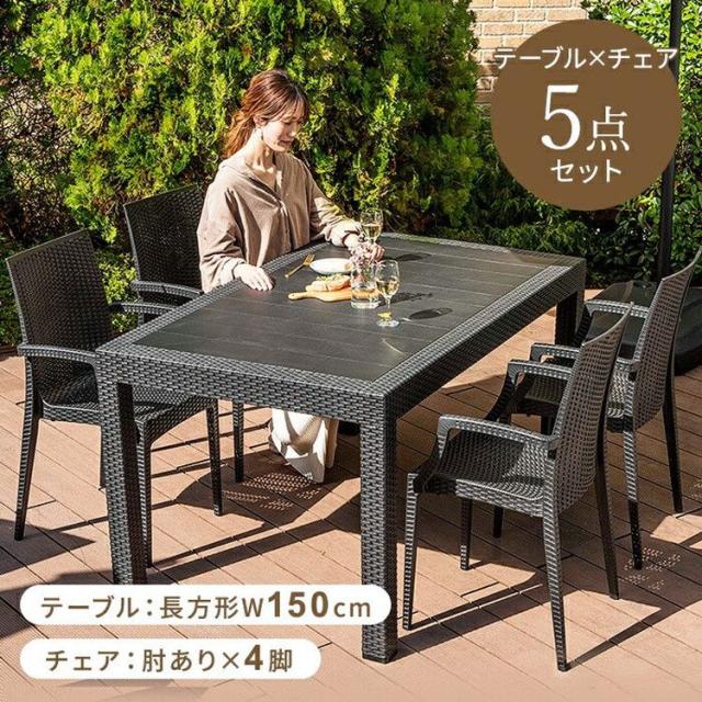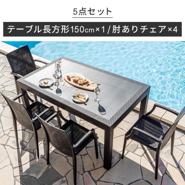 ラタン調 ガーデン 5点セット ピクシス 肘付き ガーデンチェア4脚 ガーデンテーブル 幅150cm 長方形 セット 屋外 アウトドアチェア ベランダ テラス ガーデンファニチャー(代引不可)【送料無料】