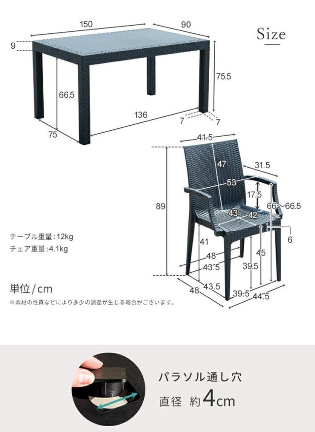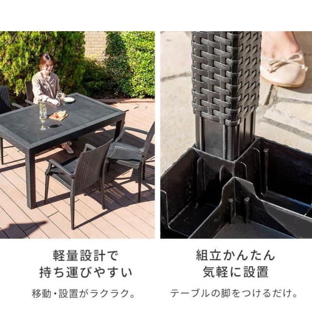 ・テーブルは、天板の真ん中に穴が空いているので、パラソルを差し込むことが可能です。
