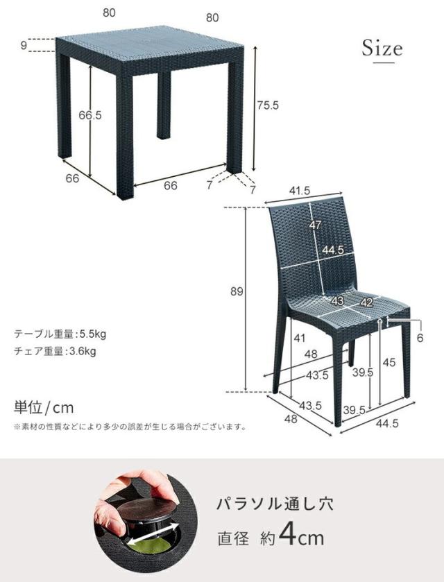 ・テーブルは、天板の真ん中に穴が空いているので、パラソルを差し込むことが可能です。