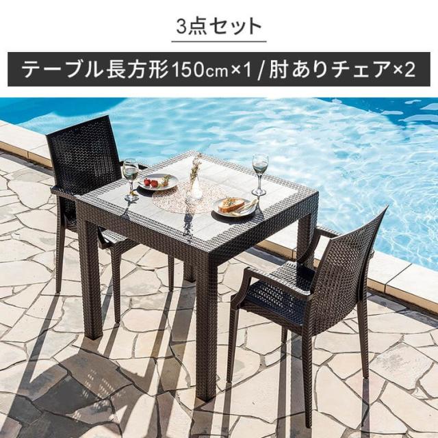 ラタン調 ガーデンテーブル W80テーブル 肘付きチェア 3点セット