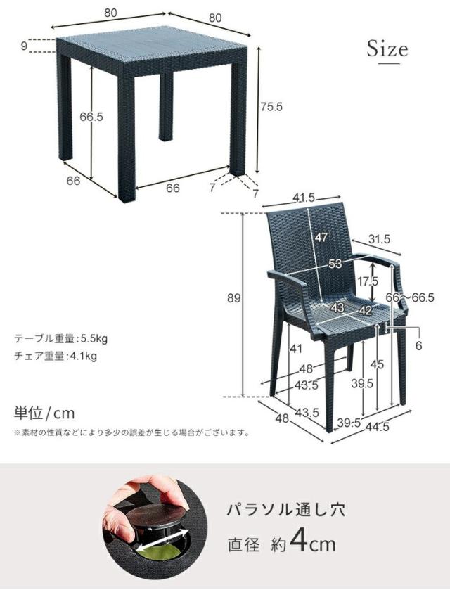 ・テーブルは、天板の真ん中に穴が空いているので、パラソルを差し込むことが可能です。