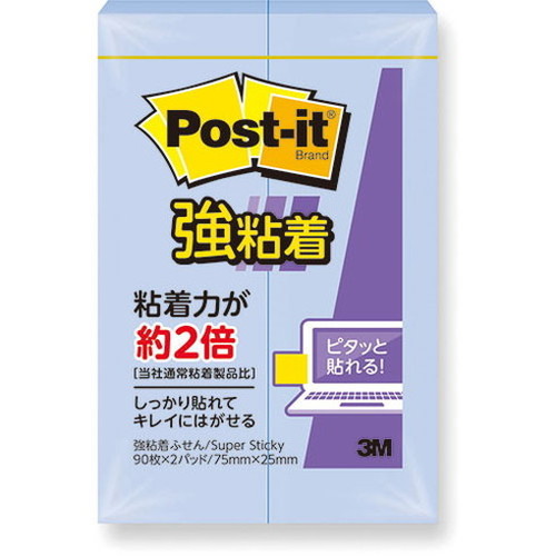 オフィスの定番、ポスト・イット(R)強粘着ふせん/粘着メモ。粘着力が約2倍の強粘着タイプです。(当社通常粘着製品比)パソコンや電話、キャビネットなどの樹脂面や垂直面など、今まではがれやすかった場所にもしっかり貼れます。また、繰り返しはったりはがしたりできます。水分散性粘着剤を使用しています。