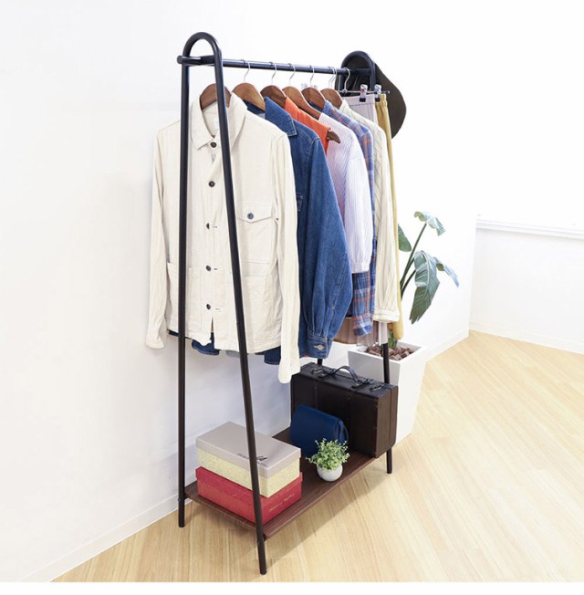 マットブラックフレームに木目が映える、シンプルモダンなデザインのパイプハンガー。