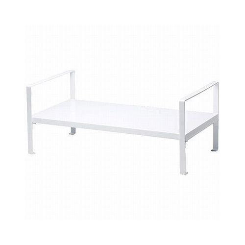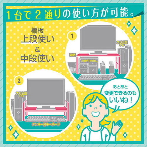 デスクの上に置くだけで、収納力がアップ!オフィスでよく使われるPCモニタのサイズに合わせたピッタリ設計です。棚上は19インチモニタが収まるサイズです。棚下にはテンキー付のフルサイズキーボード、17インチ液晶ノートPCが収まります。棚板の位置は上段・中段で変更が可能!その時の用途に合わせた棚の高さ・収納サイズで使用できます。脚には傷つき防止スポンジ付きですのでデスクの上を傷つけません。