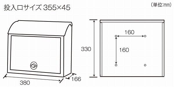 ●製品サイズ 幅:380mm,奥行:166mm,高さ:330mm,投入口幅:355mm,投入口高さ:45mm ●仕様 A4対応 上入前出 シリンダー錠 底面取付 壁面取付 I字取付