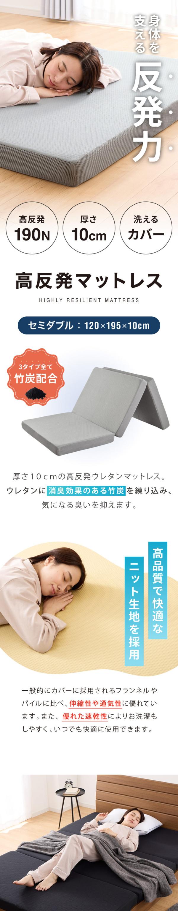 マットレス 高反発 セミダブル 3つ折り 厚さ10cm 炭入り リバーシブル 体圧分散 通気 高反発マットレス 三つ折り 190N 敷布団 高密度【送料無料】