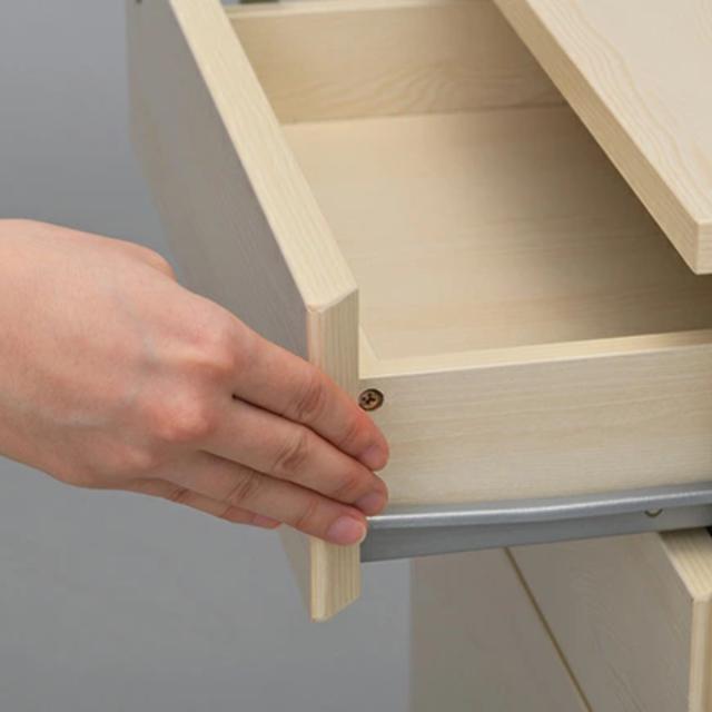 引出し正面に取っ手のない、すっきりとしたデザインです。前板両端の斜めにカットされた部分に手を掛けて引出しを開けます。