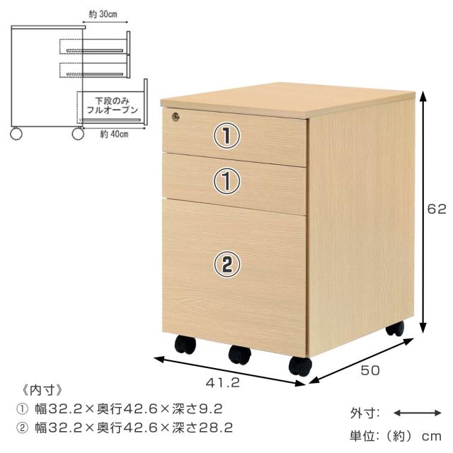 | サイズ | 約 幅41.2×奥行50×高さ62(cm) 引出し内寸:幅32.2×奥行42.6×高さ(上・中段)9.2(下段)28.2(cm) |